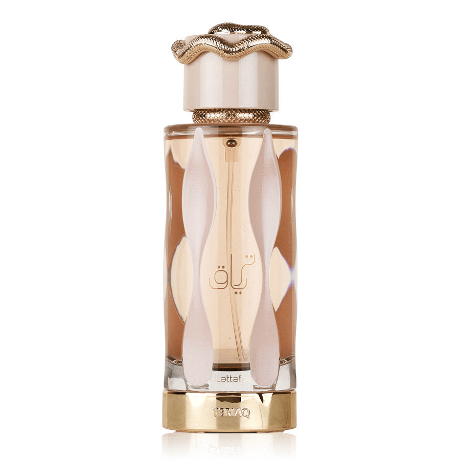 Teriaq от Lattafa Perfumes е аромат за жени и мъже. Това е нов аромат. Teriaq стартира през 2024 г. Носът зад този аромат е Quentin Bisch. Връхните нотки са карамел, горчив бадем, розов пипер и кайсия; средните нотки са мед, ревен, бели цветя и роза; базовите нотки са кожа, ванилия, мускус, ветивер и лабданум.